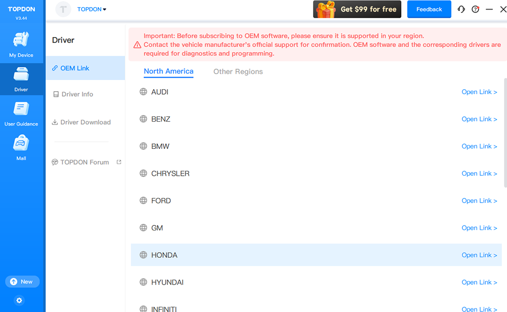 RLink Lite presents a comprehensive solution with our proprietary DMS (Driver Management System). Effortlessly access a diverse range of drivers for seamless integration with OE software. Navigate with ease using built-in OEM operation guides to swiftly master OE software. Simplify the process with a single click to download and update drivers. TOPDON always stands by technicians every step of the way and prepares them for the challenges and opportunities that lie ahead.