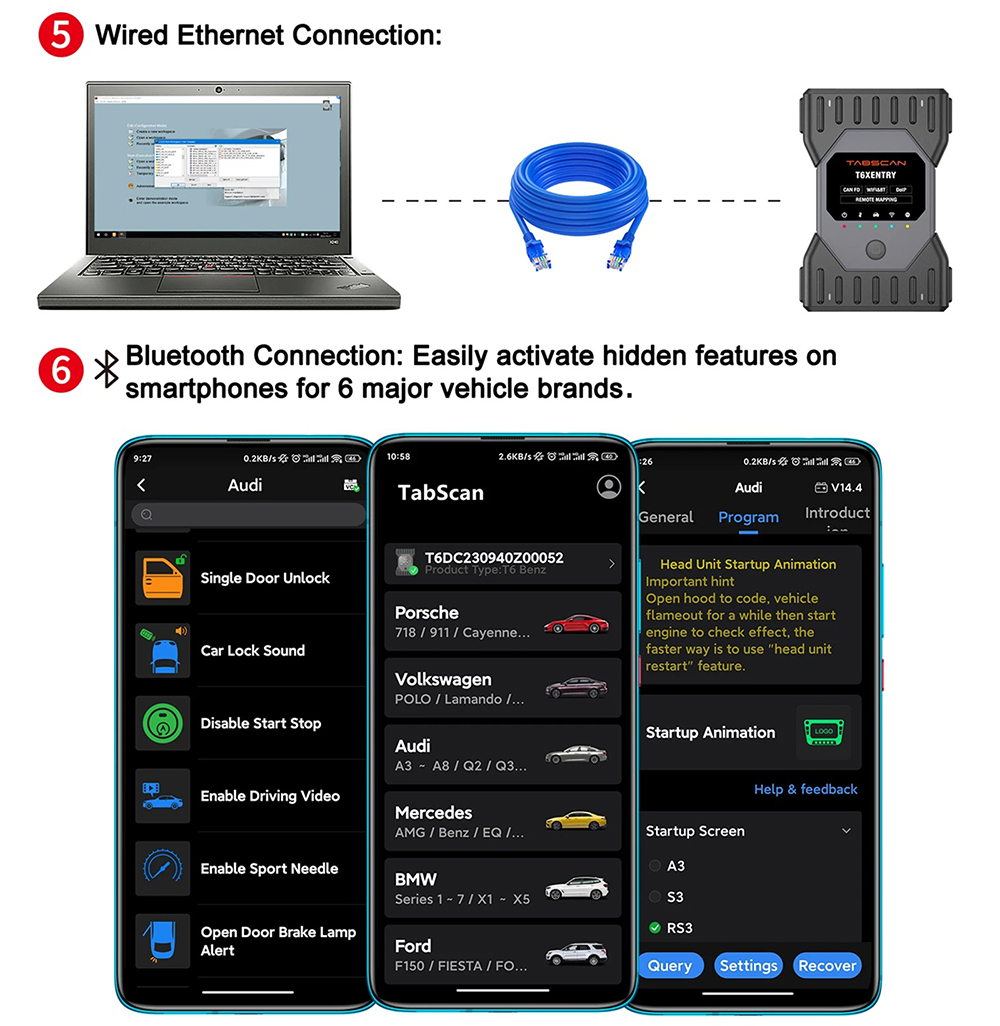 EUCLEIA TabScan T6XENTRY is fully compatible with EUCLEIA TabScan Mobile APP. With this APP, you can easily unlock hidden vehicle functions with a single tap. It currently supports 6 major brands and offers a unique remote mapping feature, allowing device mapping to a remote computer for advanced diagnostic capabilities.