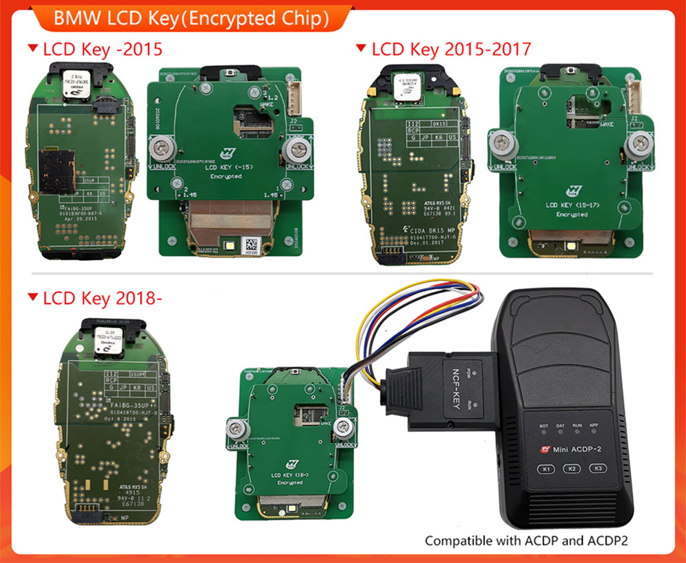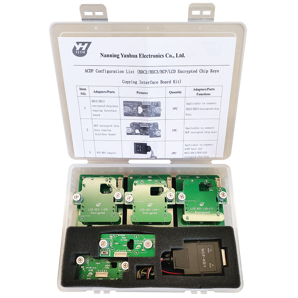 Yanhua ACDP BMW BDC2 / BDC3 / BCP / LCD Key / Encrypted Key Copying Interface Board Kit includes 5 interface boards and cable as in picture, need to work with ACDP / ACDP2 Programmer and Module 38 License.