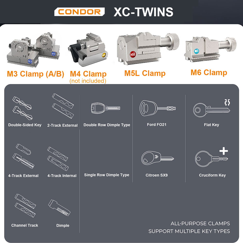 A wide duplication availability guaranteed by a variety of functional clamps, support key duplication for cars, residential use, motorbikes,etc. Support multiple key types, standard single sided, standard double sided, 2 track external, 4 track external, dimple, channel track, 4 track intemal, F021 Citroen SX9 keys, residential keys ,etc.