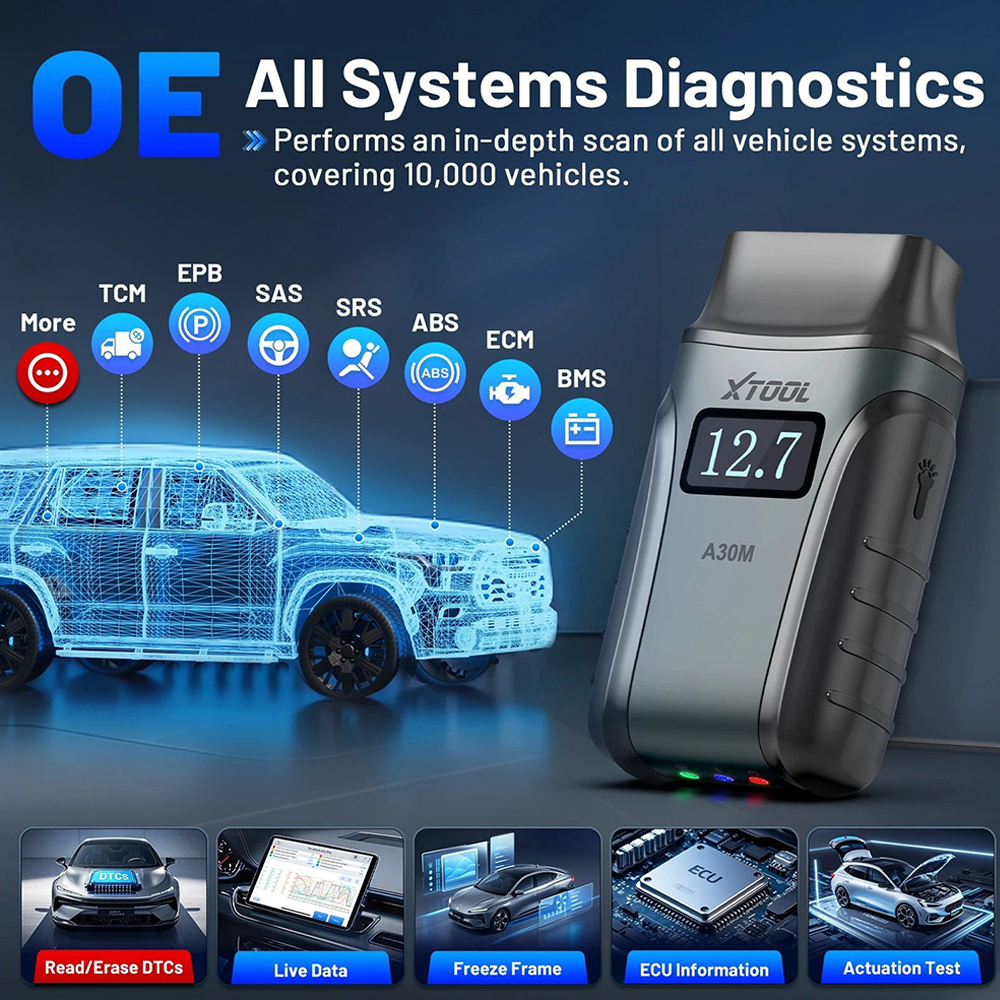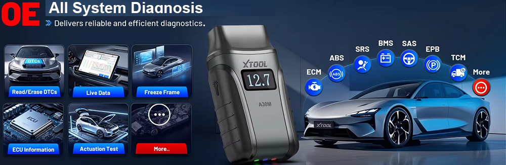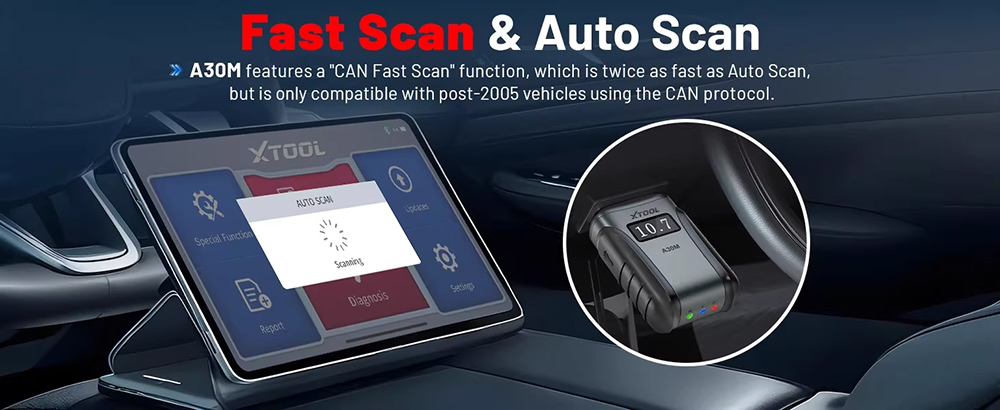 XTool A 30M diagnostic system features the latest VIN-Based Auto VIN Scan function to identify vehicles and scan all the diagnosable ECUs and run diagnostics on the selected system. This function is compatible with 2006 and newer vehicles.