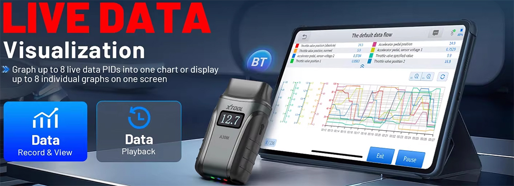 Once a vehicle diagnosis is performed, XTool A30M will record the every detail of the diagnostic process. You can record / review / playback live data anytime. The History function provides quick access to the tested vehicles and users can resume from the last operation, without the necessity of starting from scratch.