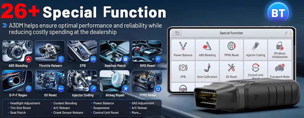 12). A30M also supports the Battery Matching, Suspension System Matching, Headlight Adjustment, Window Initialization, Airbag Reset, Electronic Water Pump Activation, Tyre Modification, De-transport Mode, Cylinder Matching...