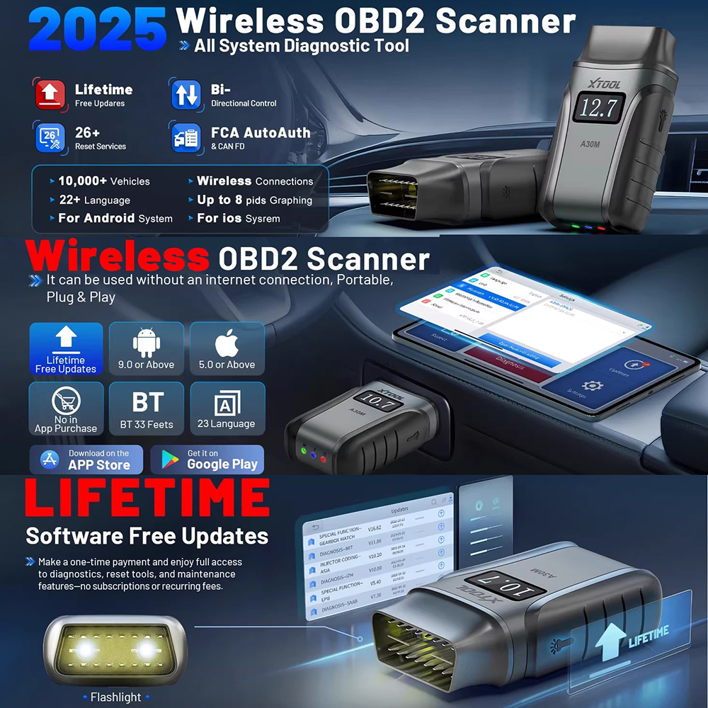 XTool A30M for Andriod / iOS Car Code Reader is an OBD2 car diagnostic tool that can read fault codes all system. It has 21 special functions to facilitate the vehicle diagnoses.