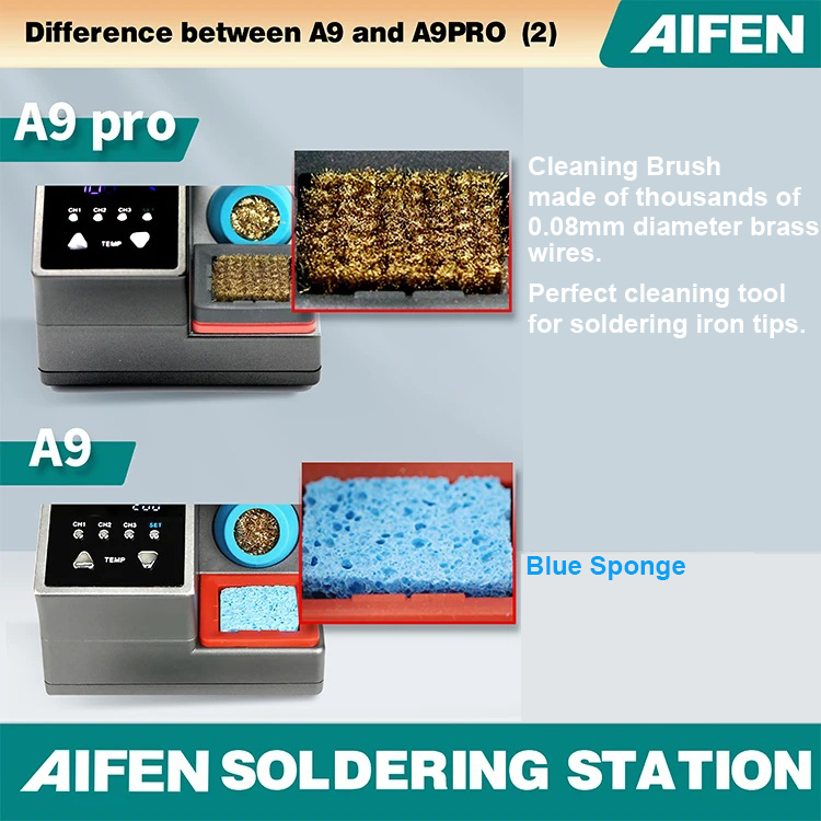 AIFEN-A9 Pro Soldering Station is developed based on precise temperature control technology and is the latest generation of soldering stations. The development focuses on: small temperature error (very small error can be achieved through calibration) fast heating, fast temperature recovery, do not compared with 936 series or DIY products, there is no comparability. Because the 936 series products are only temperature-adjusting soldering stations, the temperature difference is very large. If you choose 350 degrees, the actual temperature may be as high as 450 degrees. The DIY series is responsible for meeting some people who like high temperature requirements. Beginners, deliberately turn up the temperature. Maintenance work is not a child's play and cannot be done by feel. Temperature judgment and calibration should be based on a temperature tester.