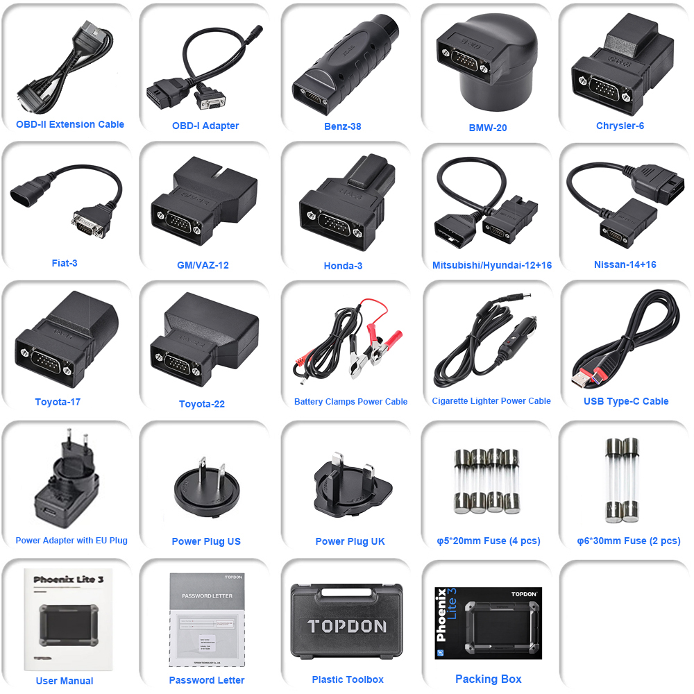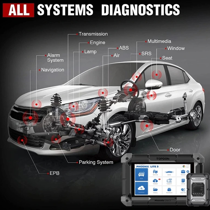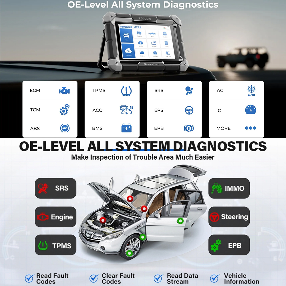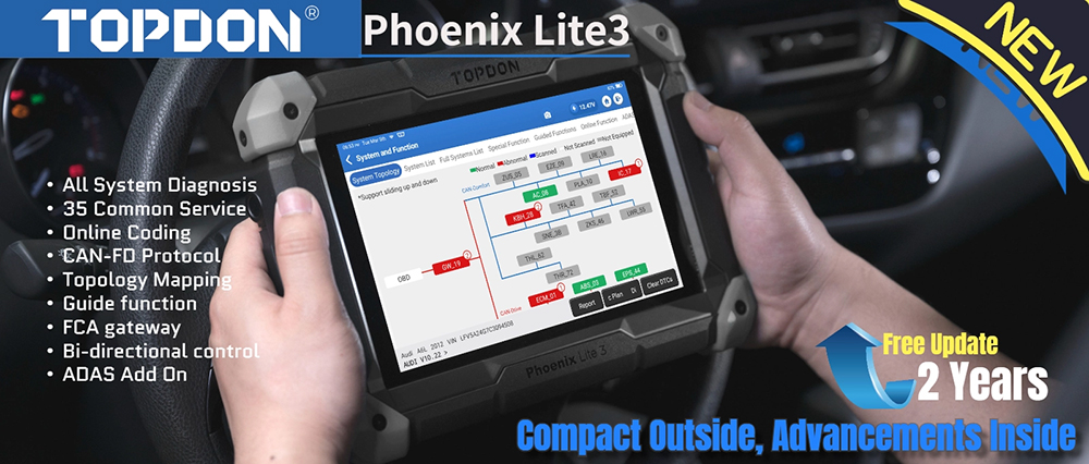 TOPDON Phoenix Lite3 automotive diagnostic scan tool perform deeper dealer-tool level diagnostics previously only available to dealership. Phoenix Lite3 OBD2 scan tool scan all available vehicle modules like ABS, SRS, Engine, Transmission, Body, IMMO, Chassis, Suspension, HVAC, Lighting System, Radio Systems to accurately locate faults and assess vehicle condition: Read/Clear codes, show DTC, turn off Check Engine Light(MIL), ABS/Airbag/Transmission Warning Lights, Reset Monitors, etc.