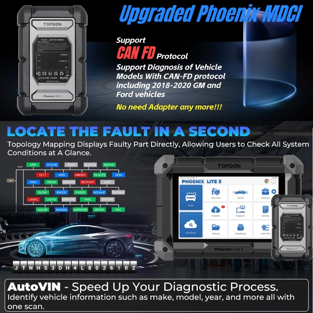 TOPDON Phoenix Lite 3 is a compact diagnostic scanner designed for automotive professionals, enthusiasts, and small repair shops. Tailored to meet the diverse needs of the automotive industry, Phoenix Lite 3 offers unparalleled functionality and affordability. With features like CAN-FD Protocol, Online Coding, Topology Mapping functions, it stands out as the top choice for a wide range of users.