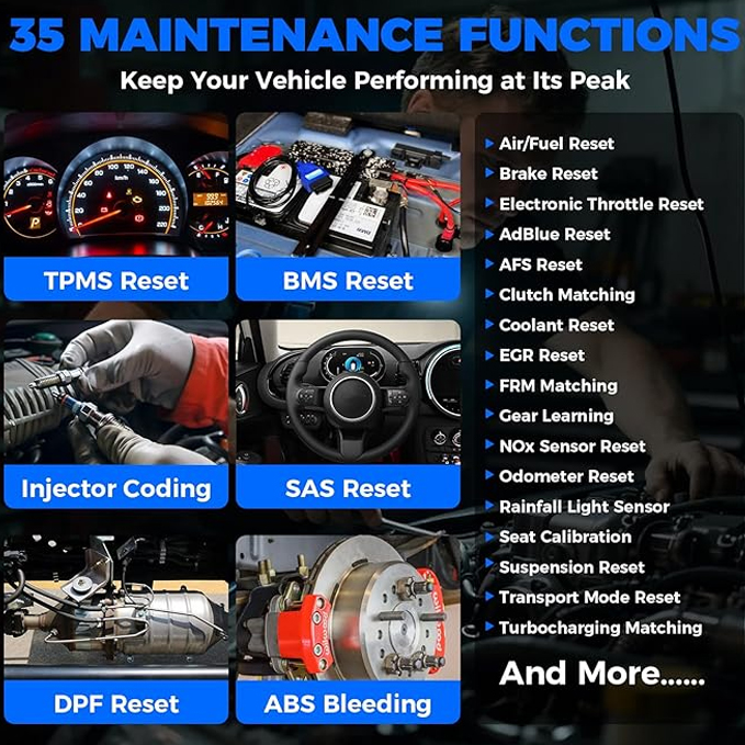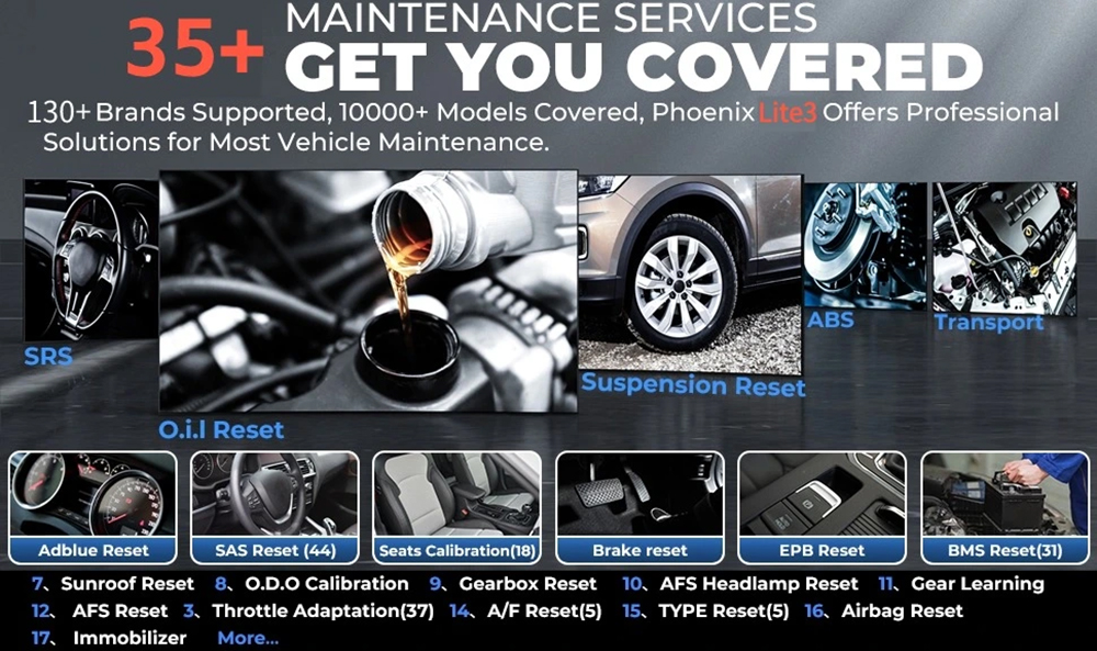 AFS Headlamp Reset, Gear Learning, A/F Reset, ABS Bleeding, Coolant Bleed, Language Change, NOx Sensor Reset, Seats Calibration, Stop/Start, Brake Fluid, Airbag Reset, Transport Mode, Type Reset, Windows Calibration, AC System Relearn/Initialization, Intelligent Cruise Control System, Engine Power Balance Monitoring, Motor Angle Calibration, High Voltage Battery Diagnostics, ODO Calibration,  etc.;
