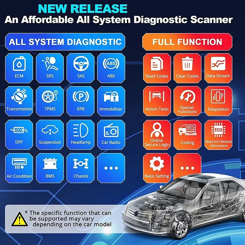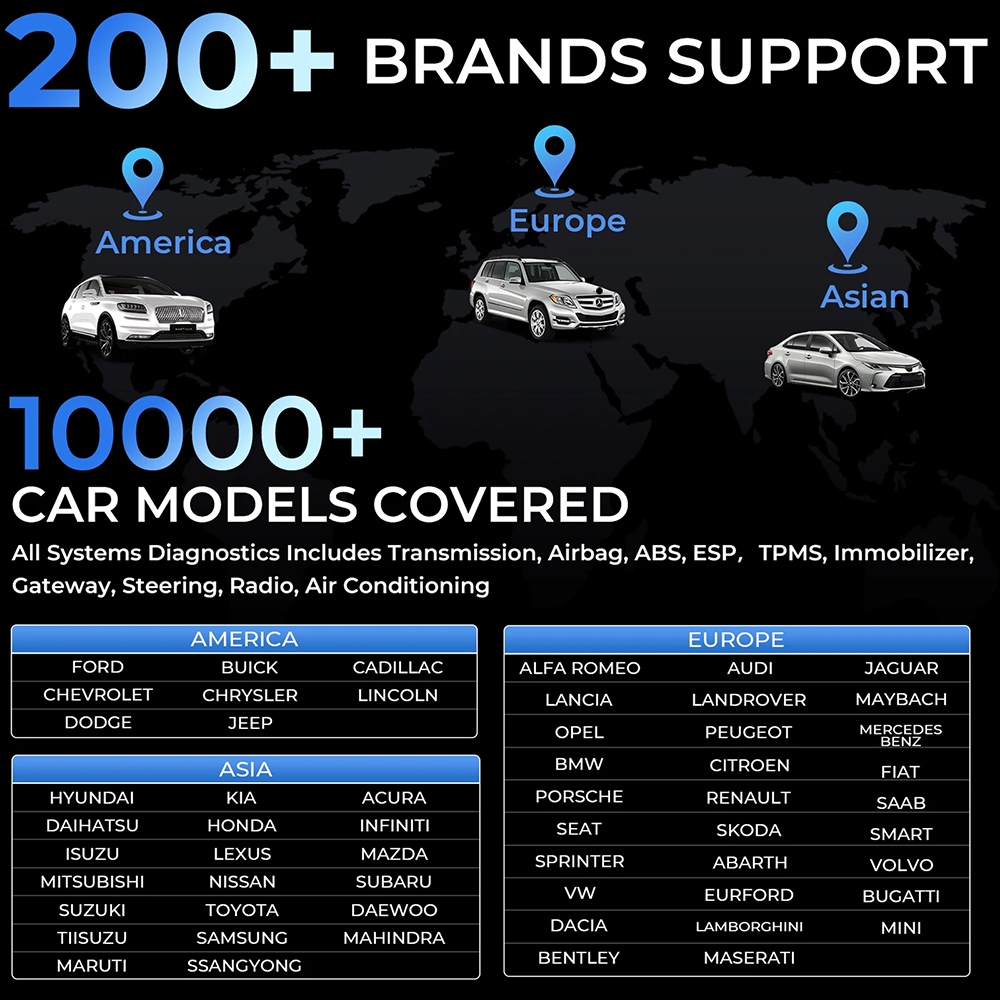 Full-System Diagnostics for 200+ makes and 10000+ models, including ABS, SRS, Engine, Transmission Systems.