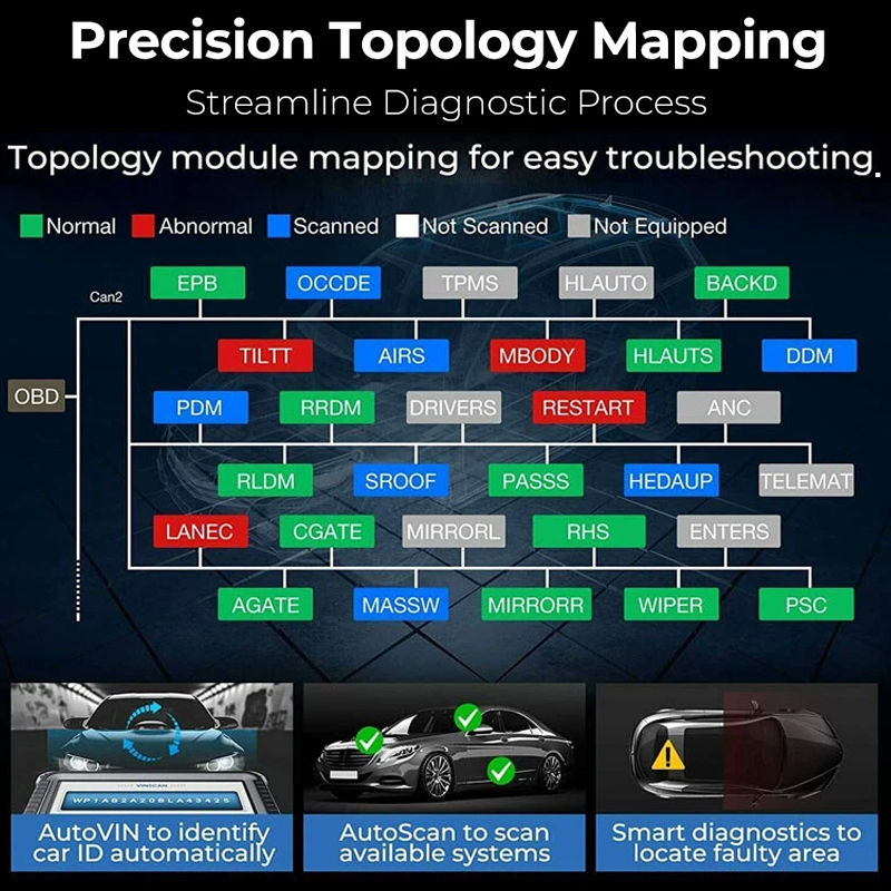 Intuitive color-coded topology display of all structures between vehicle modules for easy troubleshooting. Enhance communication efficiency and troubleshoot with accuracy, providing a comprehensive depiction of vehicle systems and statuses.