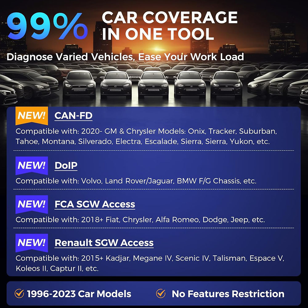 Powered by DoIP & CAN FD protocols, the newly released OTOFIX D1 Max2 can run 4 times higher speed data transfer and diagnostics without any adapters. This 2023 version auto scan tool also opens secure access to FCA vehicle business (by AutoAuth registration) and Security Gateway Function for Renault, which allow technicians to do diagnostics without any restriction.