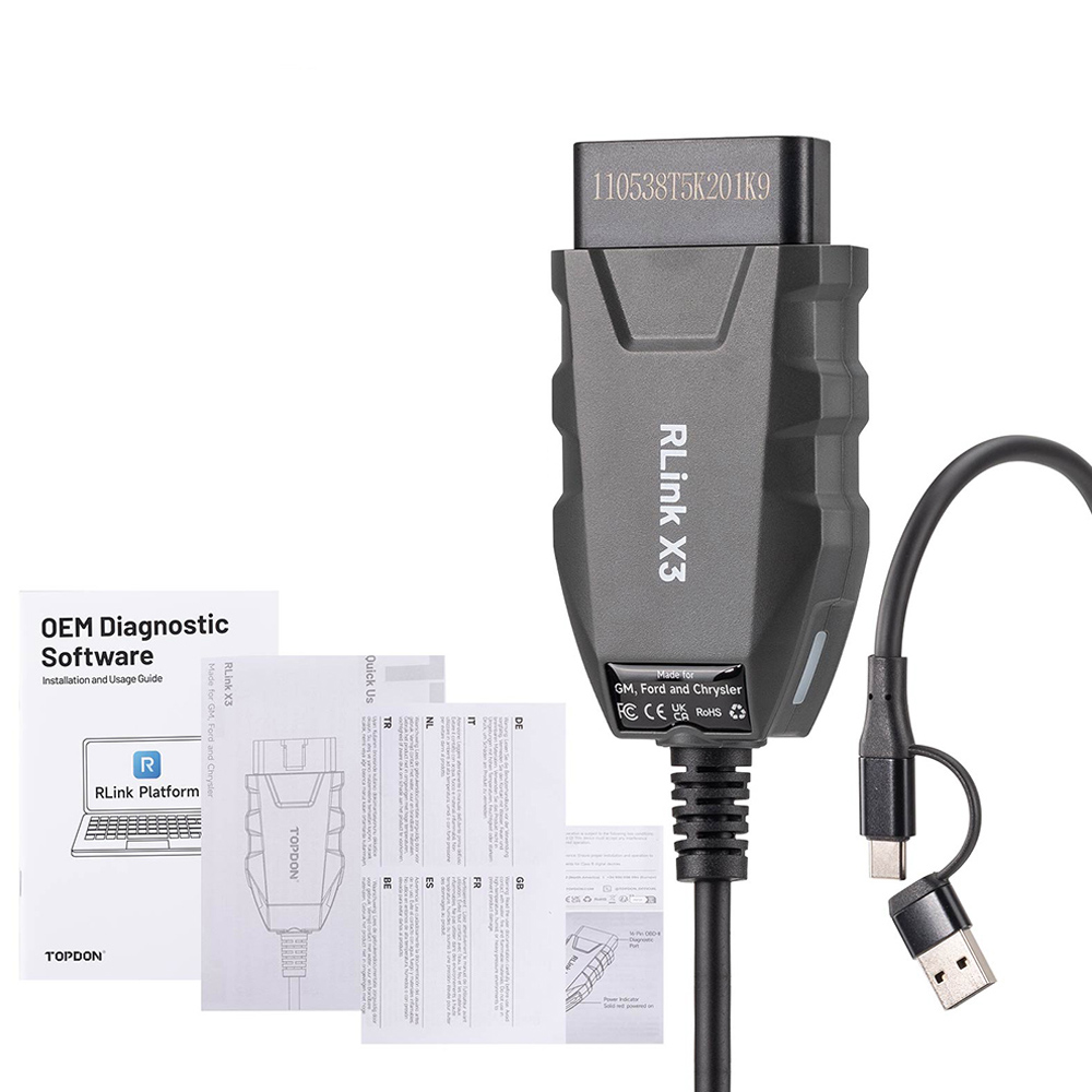 TOPDON RLink X3 is a 3-in-1 OEM-specific VCI (Vehicle Communication Interface) developed for the US market. RLink X3 J2534 supports the three major American automakers (Ford, GM, Chrysler) as well as their sub-brands and models. TOPDON RLink X3 is compatible with OEM software for GM (TLC/GDS2, Tech2Win, SPS), Ford (FJDS, FDRS, FORScan), Chrysler (WiTECH 2.0).