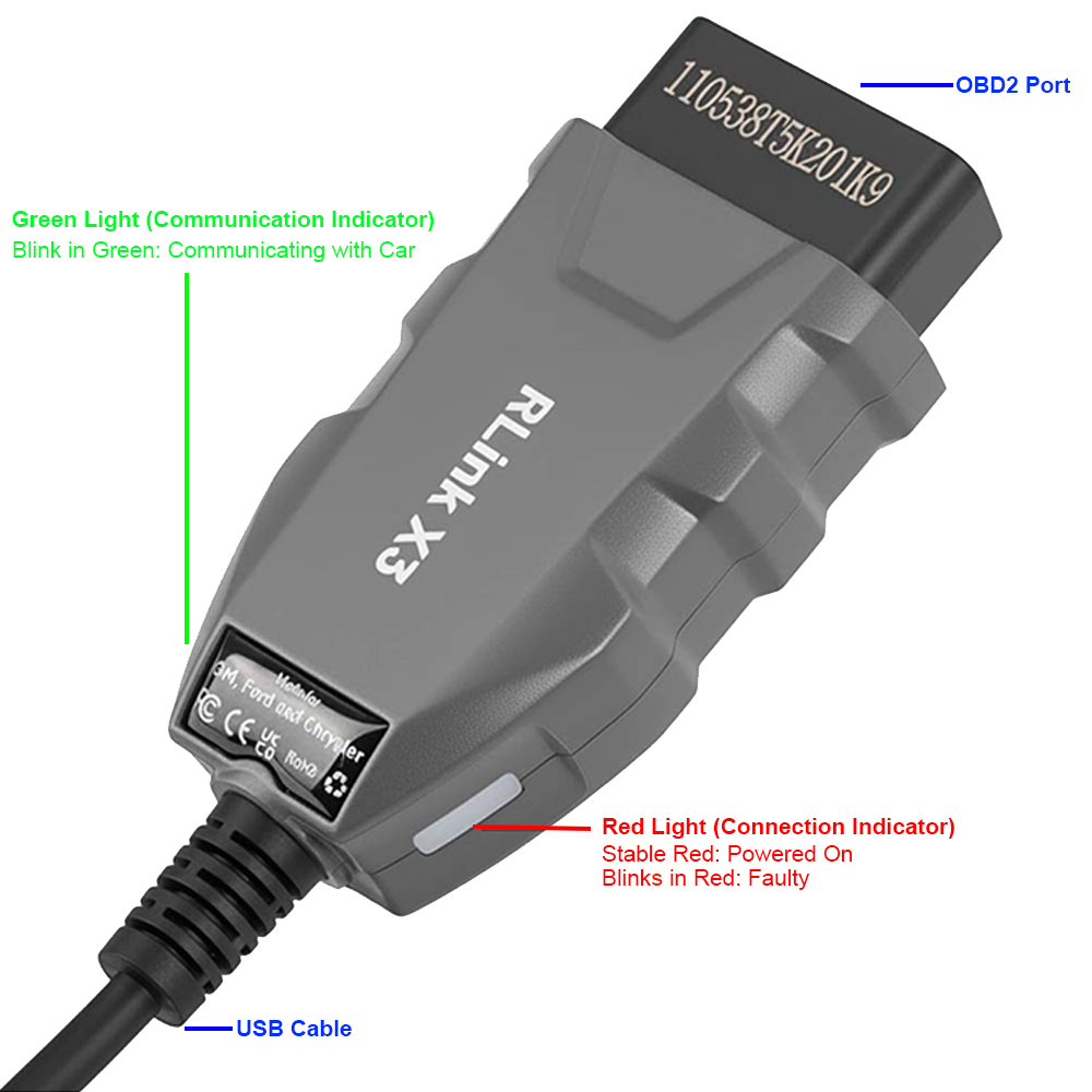 Red Light (Connection Indicator): Stays solid when the device is connected to the vehicle's DLC and blinks when there is faulty.