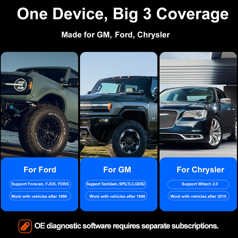 2. Multi-Brands Compatibility: One device supports multiple OEM software simultaneously. e.g. RLink X3 is compatible with over 8 OE software systems from three major automakers: Ford, GM, Chrysler.