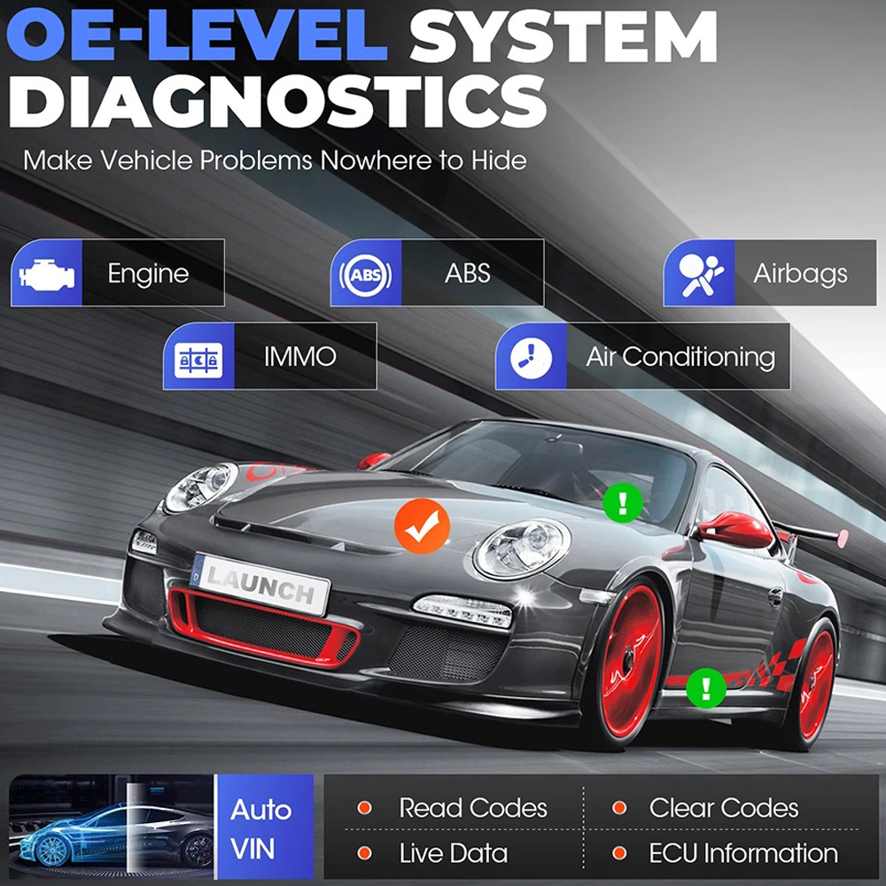 As an OE level automotive diagnostic tool, Launch CRP919E can access most car ECUs to Read/Clear Codes, Retrieve Live Data, Freeze Frame, ECU Information and perform Active Tests, Matching, Adaptation, Turn Off Warning Lights, Reset Monitors. Full range car models and full car system diagnose make it a professional automotive diagnostic tool.