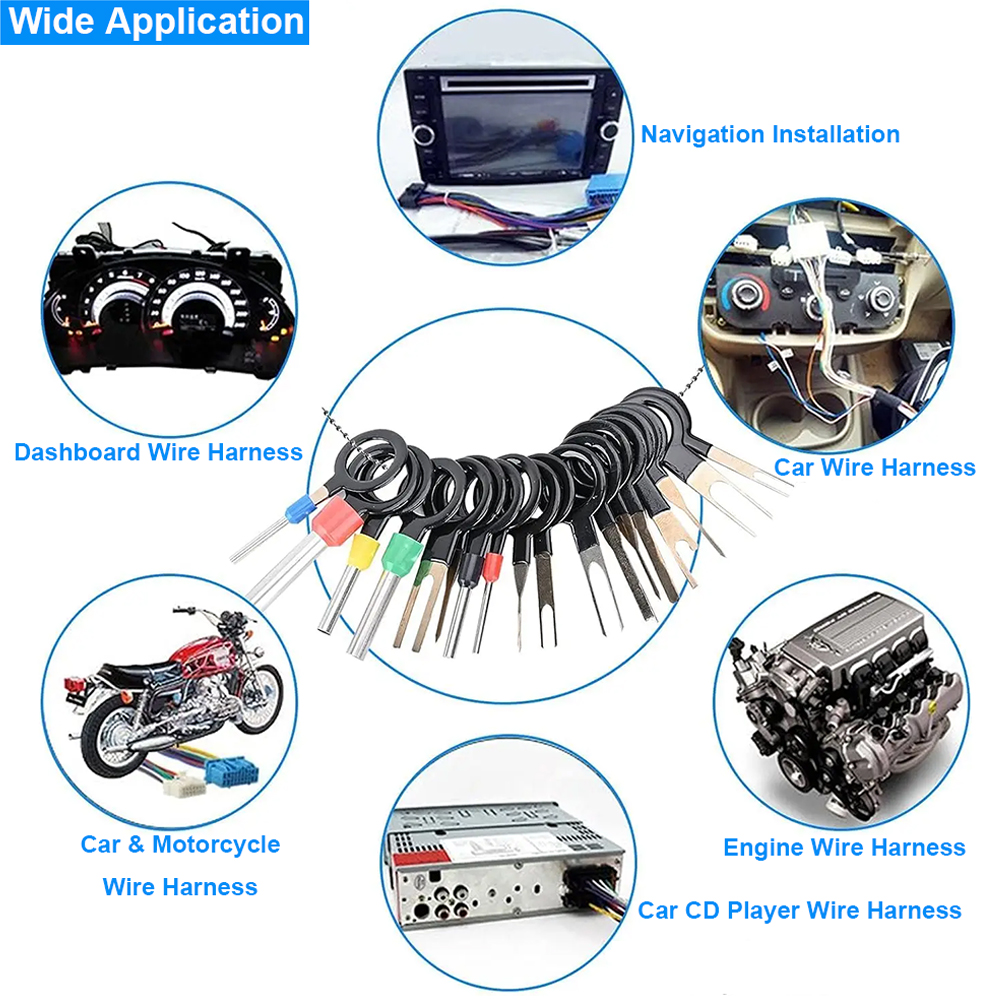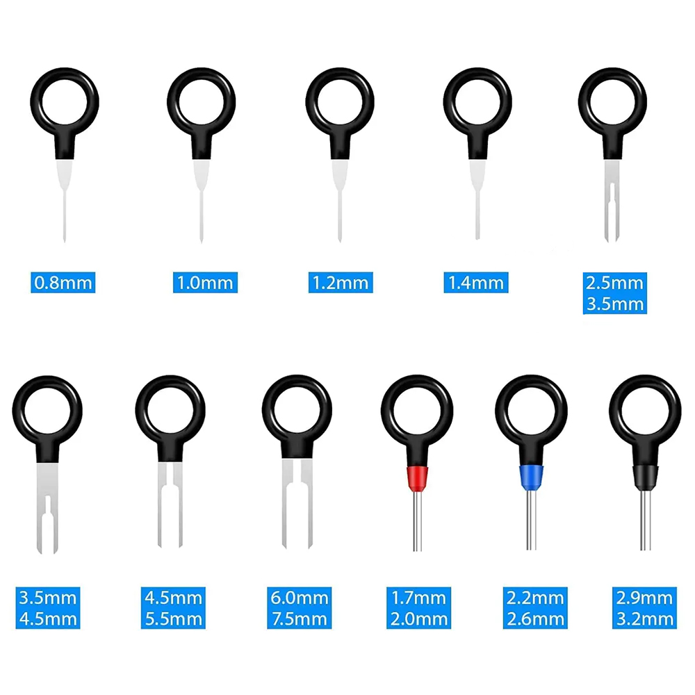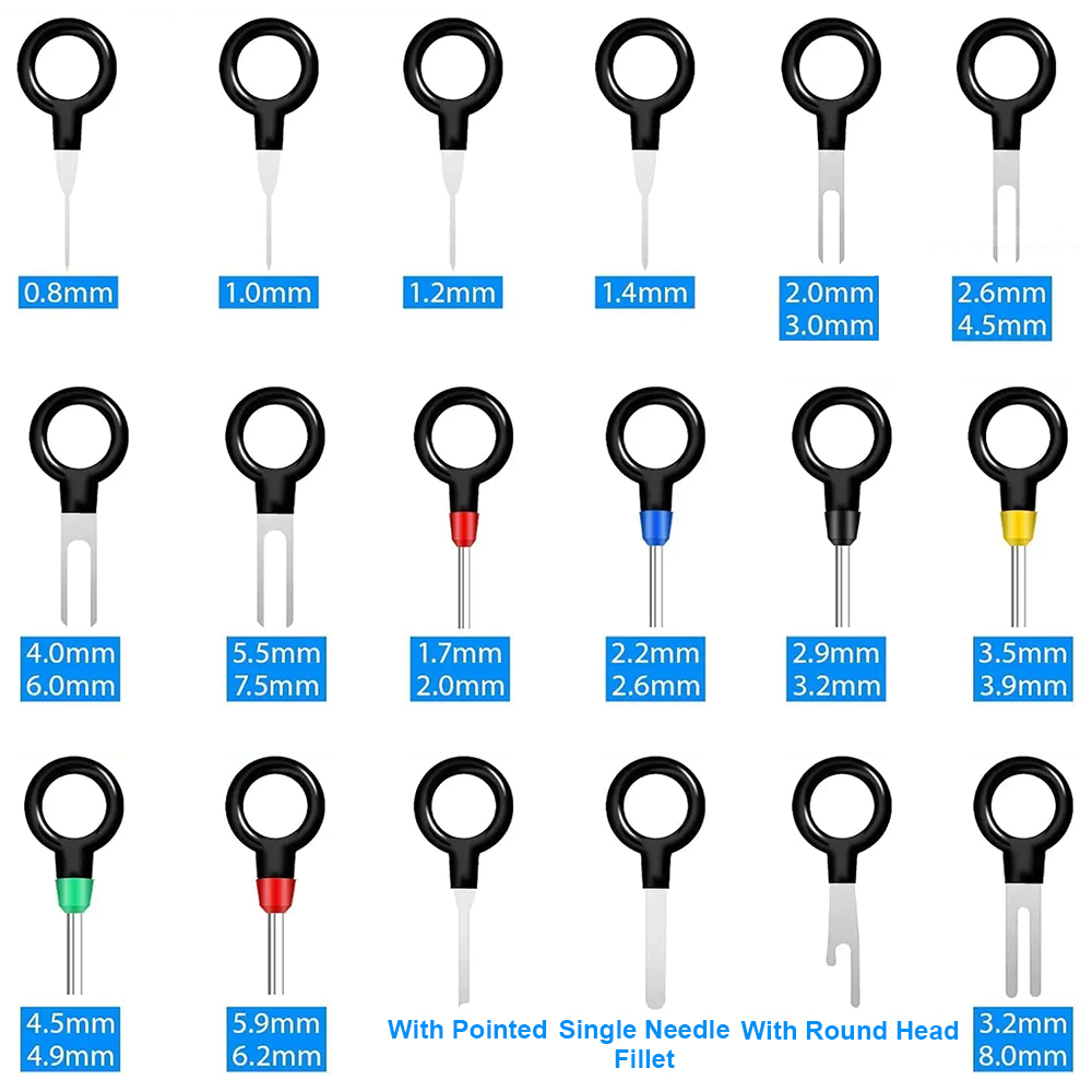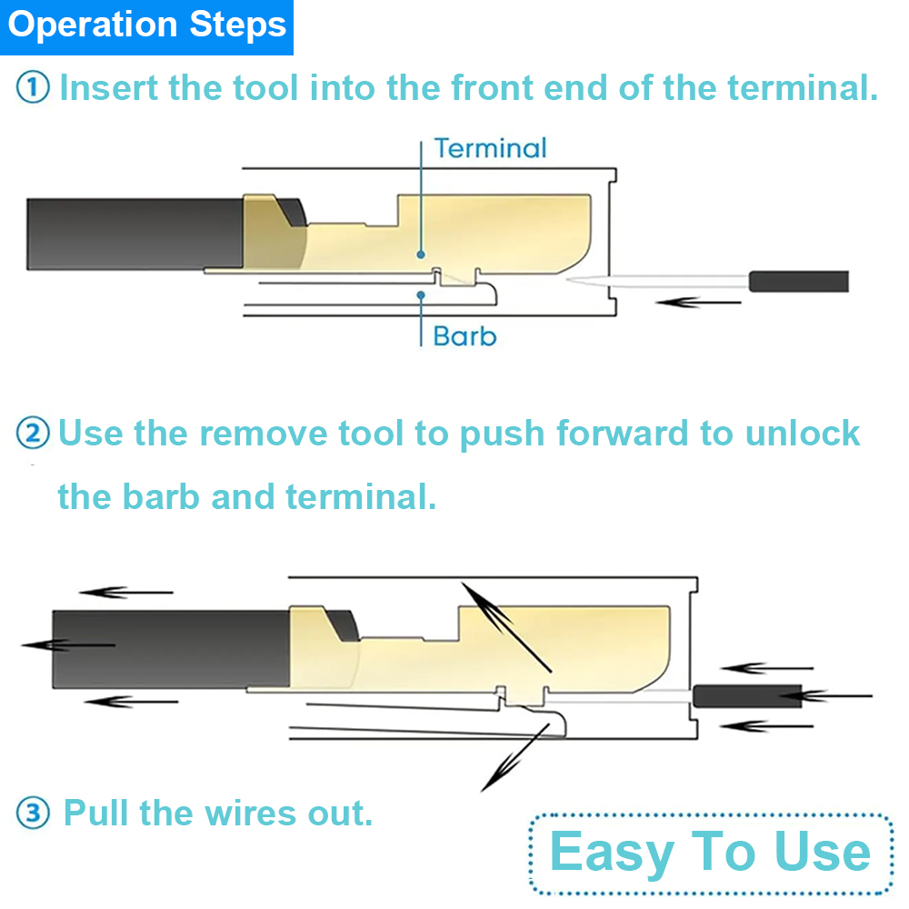 Cable End Pin Remove Tool Kit is easy to use, just push and pull the terminal pins with connector removal tool for removal effortlessly from the wire harness connectors without any damage. Kindly Note: Most of the wire harnesses are held in place with barb clips. You can use a tool to lift or flatten the barbs, and then gently pull out the wire ends. Pay special attention to strength and direction.